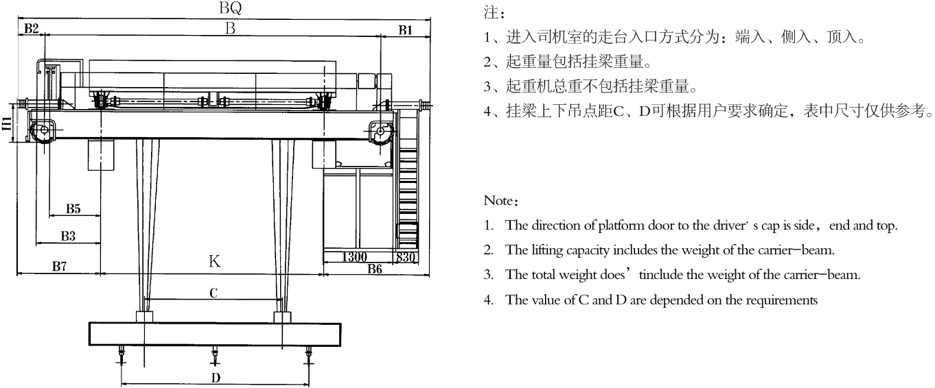 本起重机采用挂梁吊运长件钢坯、板材、棒材、盘圆等物品,配置电磁吸盘或夹钳或特殊群钩进行吊装,主要由箱形桥架、起重小车、大车运行机构、司机室和电气控制系统组成,配有停电保磁系统。起升机构多采用单电机、双减速器、双卷筒布置,呈双吊点形式。挂梁布置形式分垂直于主梁或平行于主梁两种。其余形式与QD型起重机相同。
