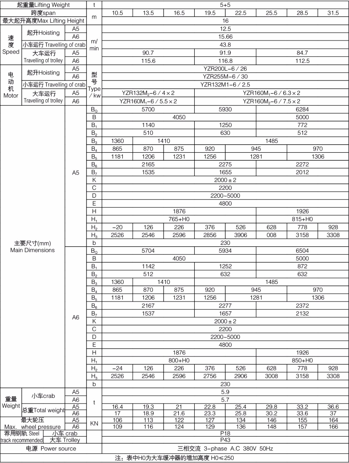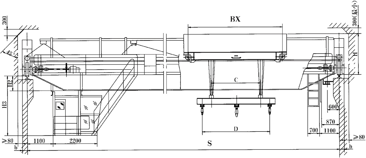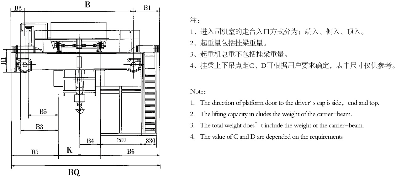 本起重机采用挂梁吊运长件钢坯、板材、棒材、盘圆等物品,配置电磁吸盘或夹钳或特殊群钩进行吊装,主要由箱形桥架、起重小车、大车运行机构、司机室和电气控制系统组成,配有停电保磁系统。起升机构多采用单电机、双减速器、双卷筒布置,呈双吊点形式。挂梁布置形式分垂直于主梁或平行于主梁两种。其余形式与QD型起重机相同。