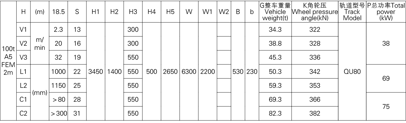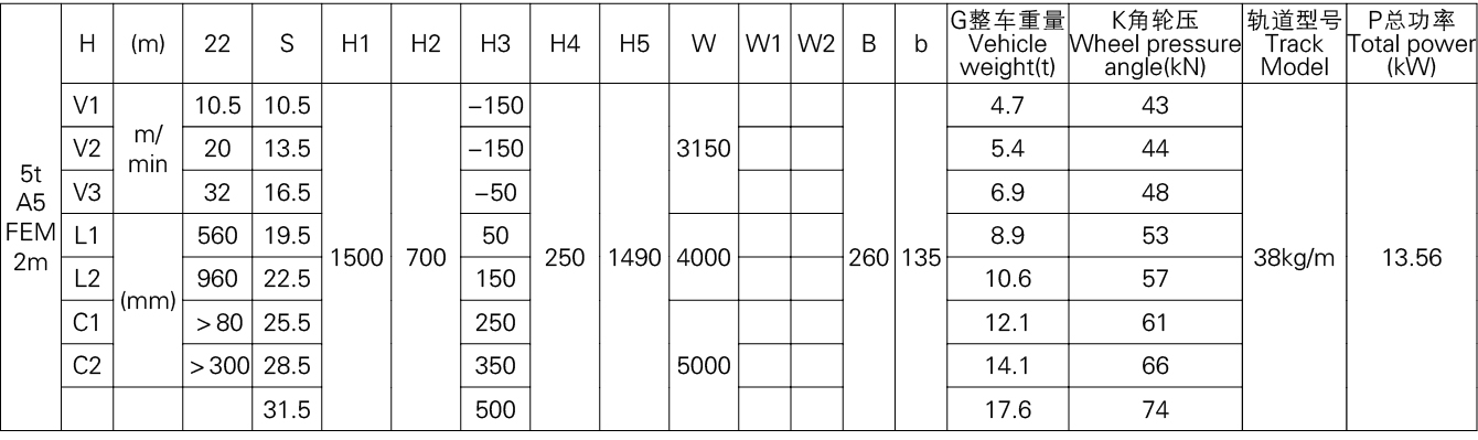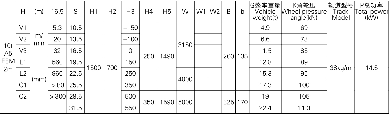 1、本产品系列表仅列出了常用的基本的规格起重机,工作级别为A5(FEM 2m)时的标准跨度,没有副钩的室内用起重机。客户根据需要可以提出相应的要求。